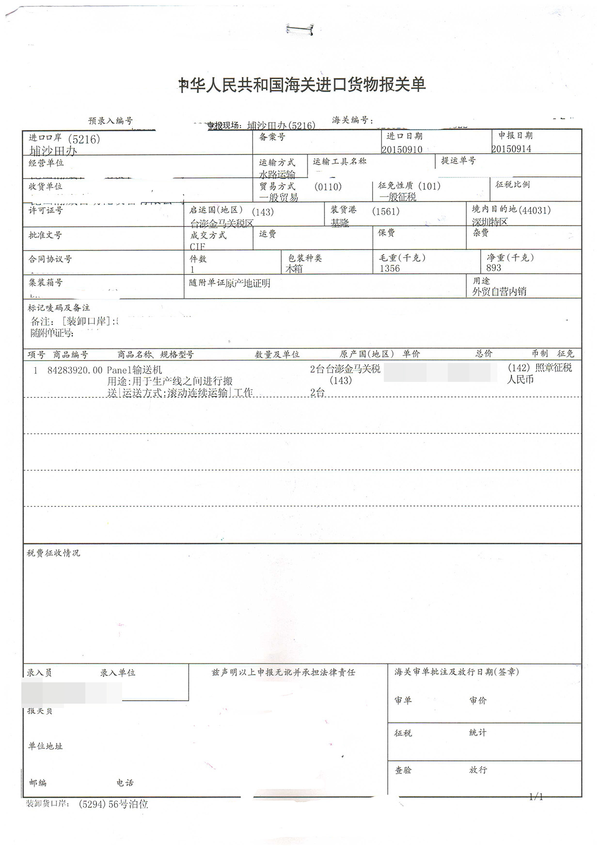 進(jìn)口日期:20150910