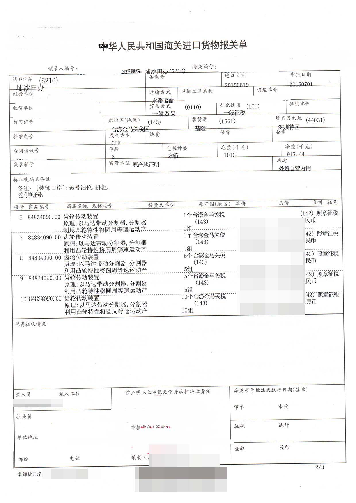三、齒輪傳動裝置進(jìn)口報(bào)關(guān)案例展示