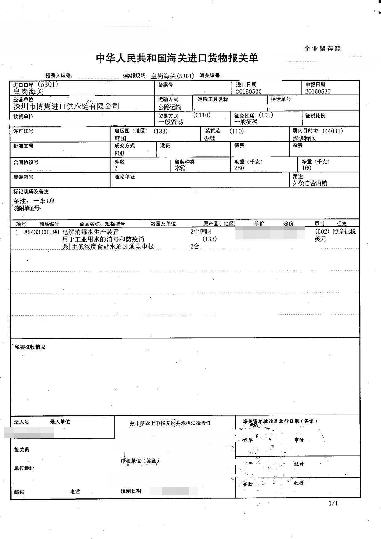 三、電解消毒水生產裝置進口報關案例展示