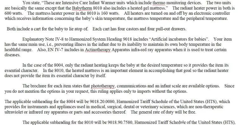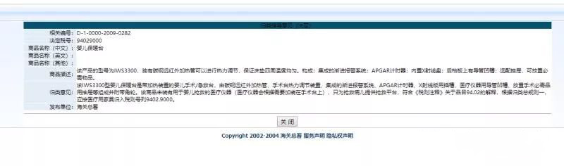 美國(guó)海關(guān)認(rèn)為:嬰兒保溫臺(tái)的主要功能與注釋品目90.18中的“嬰兒人工保溫箱”等醫(yī)療設(shè)備類似,目的為了防止嬰兒生病,應(yīng)按醫(yī)療設(shè)備歸入品目90.18。