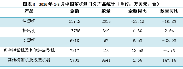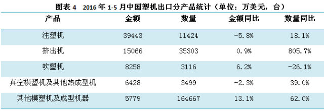 從圖表4來看,1-5月,中國塑機出口方面波動不大,金額方面,注塑機和真空模塑機及其他熱成型機略微下降,擠出機、吹塑機、其他模塑機及成型機器雖有增長,但幅度不大。