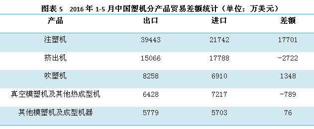 圖表5的統(tǒng)計數(shù)據(jù)表明,2016年1-5月中國塑機的五大類產(chǎn)品進(jìn)出口貿(mào)易中,注塑機、吹塑機、其他模塑機及成型機器等三大類產(chǎn)品均為貿(mào)易順差,擠出機、真空模塑機及其他熱成型機兩大類產(chǎn)品則為貿(mào)易逆差。