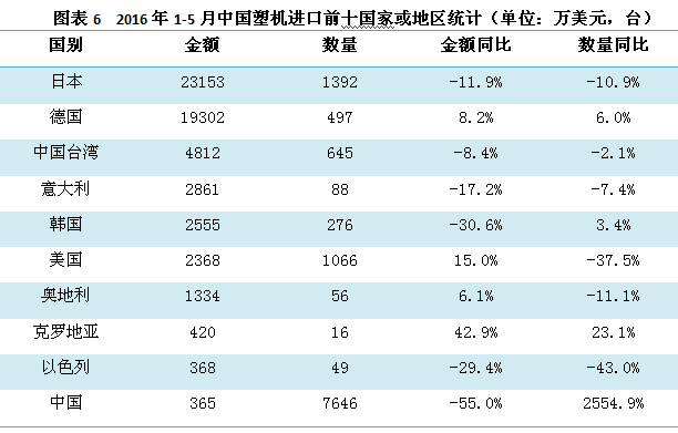 圖表6的數(shù)據(jù)表明,2016年1-5月,中國塑機進(jìn)口前十國中僅有德國、美國、奧地利、克羅地亞等4個國家保持了較大的同比增長,其余六個國家均有大 幅度的減少。日本同比下降11.9%,而在2015年的1-5月份日本的進(jìn)口金額超過了25000萬美元,且同比增長21.0%。德國增長8.2%,但去 年德國的表現(xiàn)為17843萬美元,金額同比是下降31.2%。