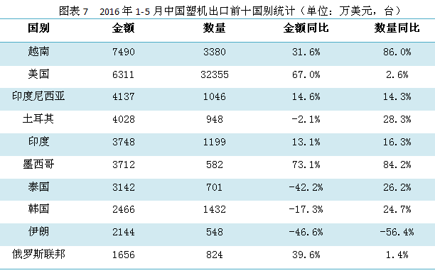 越南成為中國塑機最大進(jìn)口來源國,且同比有大幅度的增長。美國、土耳其、印度、墨西哥和俄羅斯聯(lián)邦等五個國家也分別有不同程度的增長,其中美國增幅高 達(dá) 58.2%。印尼、泰國、伊朗、韓國等四個國家出口金額同比則有大幅度的下降,其中泰國的下降幅度達(dá)到51.9%。和泰國同樣情況的還有伊朗,2016年 的前5個月中,每個月都比去年同期相比均有下降,1-5月整體下降了46.6%。