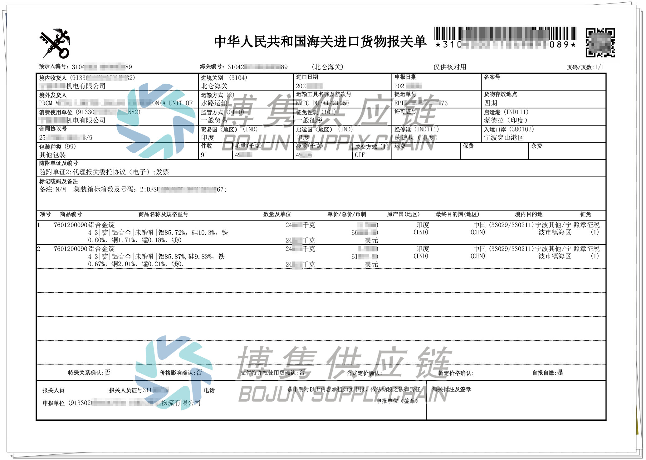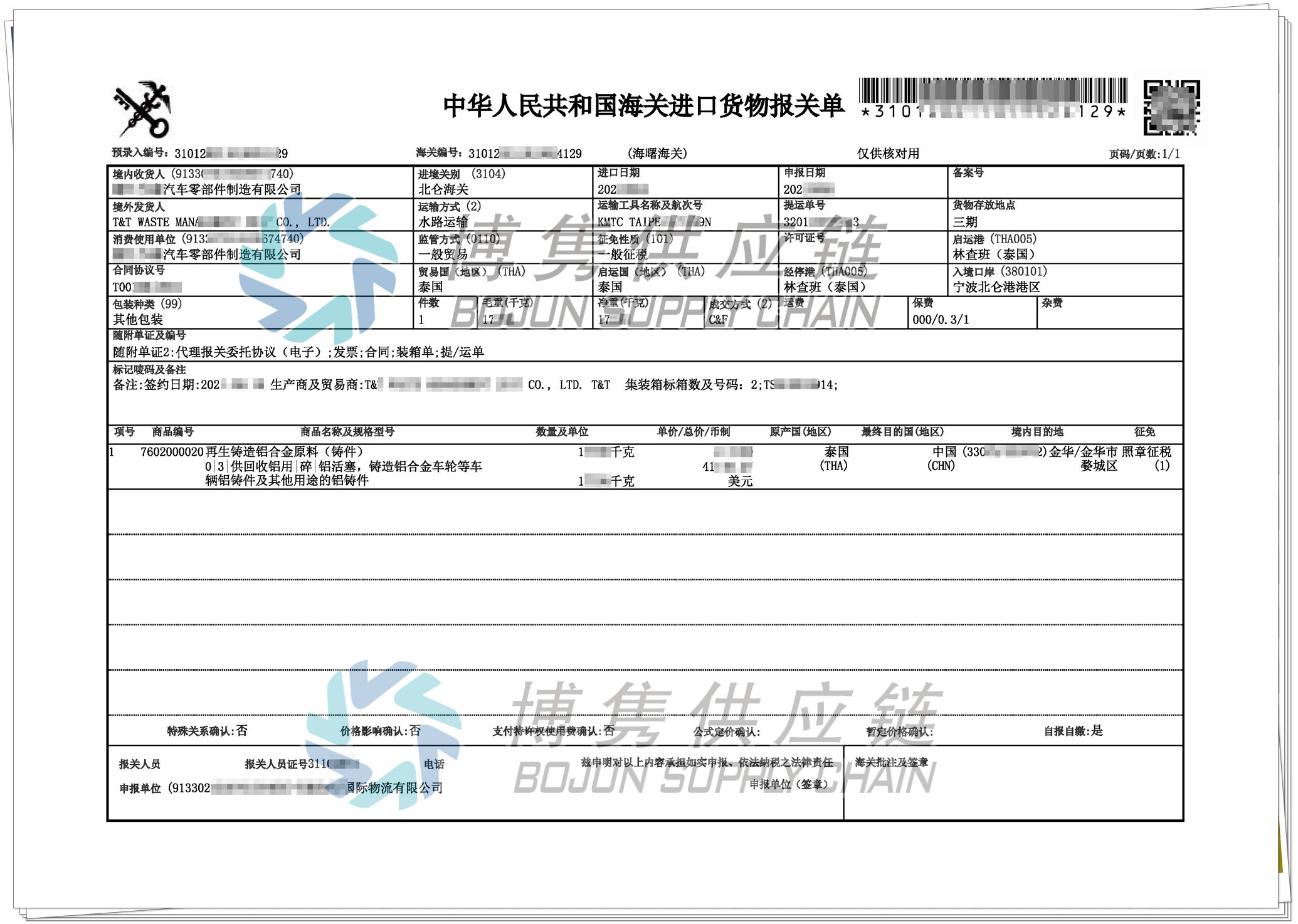 1、博雋供應(yīng)鏈對再生金屬(再生銅、鋁、鋁錠)有著豐富的進口經(jīng)驗,代理過多家企業(yè)進口。2、所有資料模板博雋皆可提供,減少企業(yè)整理資料的麻煩,省事省心,提高效率。